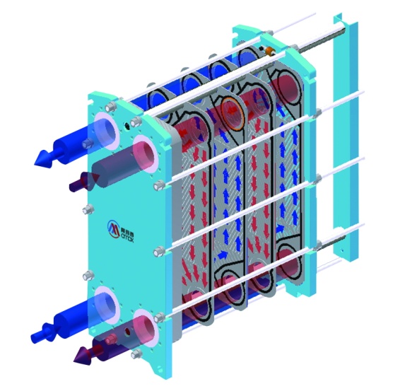 2、對(duì)數(shù)平均溫差大:流體在板式換熱器內(nèi)的流動(dòng)是并流或逆流的流動(dòng)方式,其溫差修正系數(shù)一般在0.8~0.95。